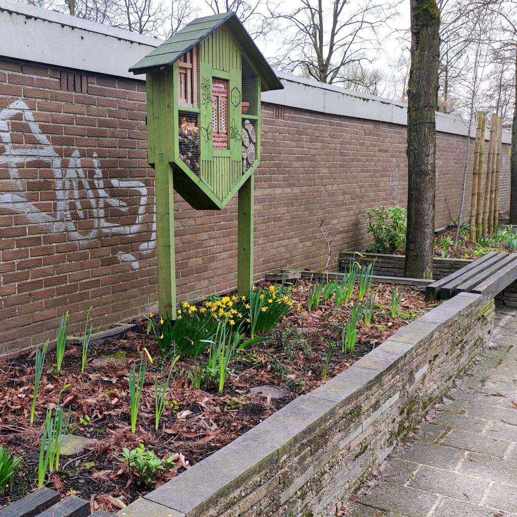 De buurttuin ligt tussen de speeltuin bij Hogerhorst/Langenhorst en het bruggetje naar De Hofjes in. Langs de garages.