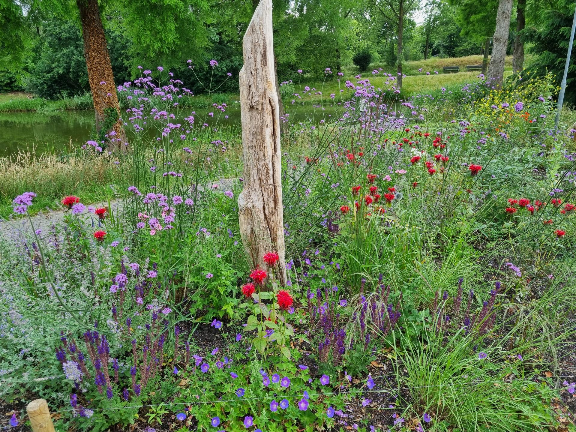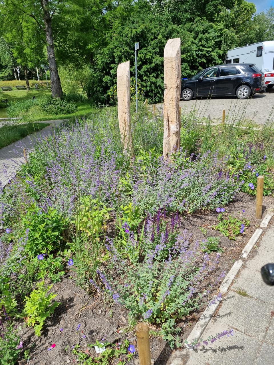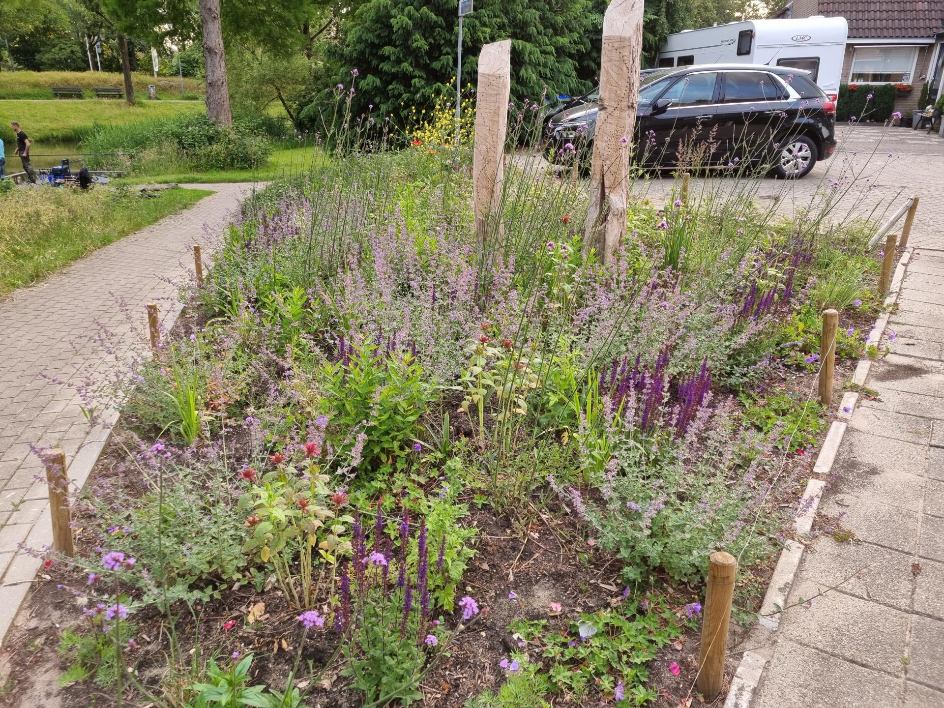 Het resultaat overtreft onze verwachtingen. De hele zomer 2022 genieten we van de bloemenzee. De twee houten palen met gaten vormen een bijenhotel.