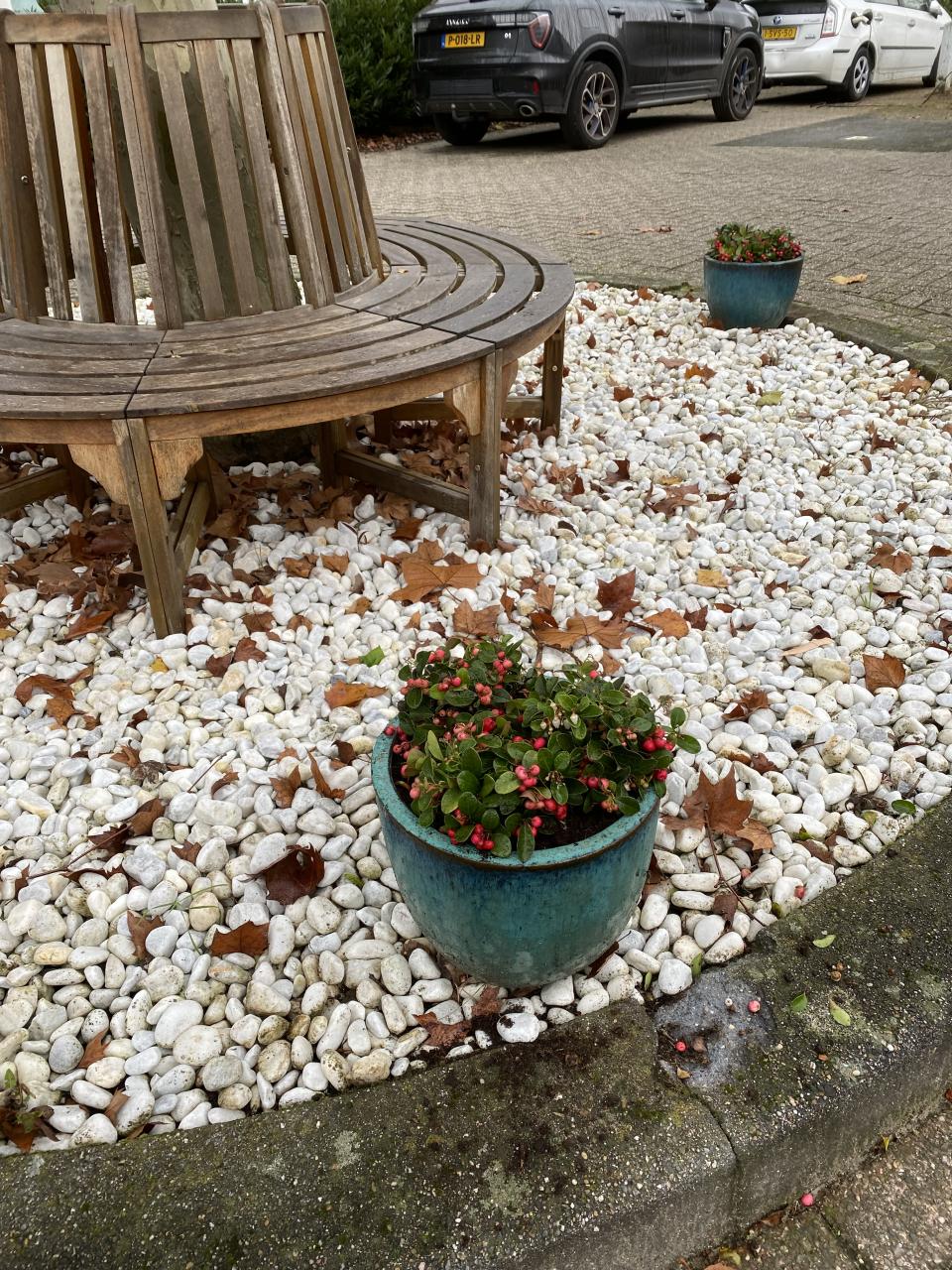 Op 2 oktober 2023 zijn de potten bij het ronde perkje om de kleine plataan voorzien van nieuwe bergthee plantjes.