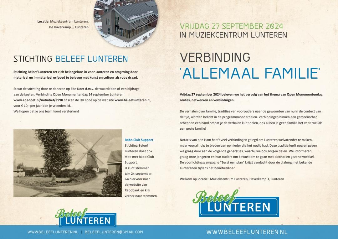 De oude spullen herinneren aan een gebeurtenis of familie of de oorlog. De opdracht voor de voorstelling ’s avonds was: jouw verhaal vertellen naar .n.a.v. een voorwerp dat je meeneemt van huis of van de markt. Het werd dan teruggespeeld door Theatergroep Theater Boven Water. Ook konden belangstellenden inschrijven voor het benefietdiner (heb je het bordje met vork met je naam erop nog?) want twee sponsoren: Aldi Lunteren en Soap & Spices Lunteren doneerden biologische producten voor een heerlijk 4 gangen diner voor 20 personen. De Regiobank ondersteunde ons met het werven van vrijwilligers. Kortom twee geweldige evenementen met verbindende thema’s!