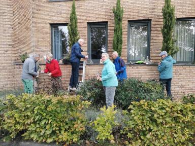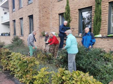 Gelukkig was het droog zodat het werk lekker vlot gedaan was. Aan de Zuidzijde in de border werden nog wat kruiden gepoot zodat iedereen volgend voorjaar lekker verse kruiden kan plukken voor de sla of in de soep.
