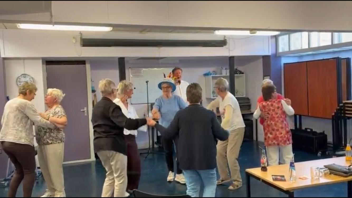 Ook ‘dansten’ we met een deelneemster zittend op haar rollator, en als je dan die brede lach op de gezichten zie, dan geven wij deze middag een 10+!!!