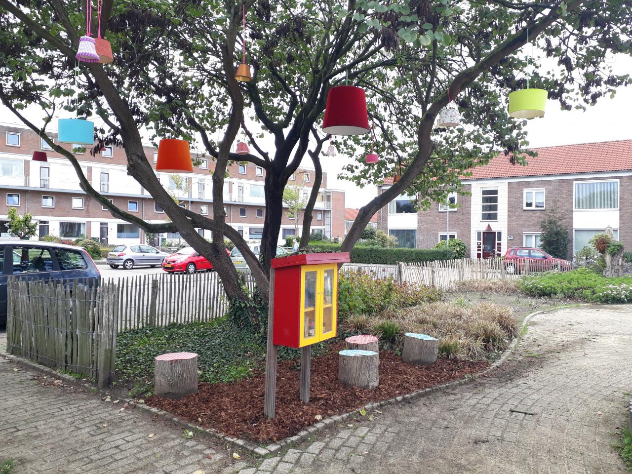 Wij zijn een enthousiaste groep mensen die samen de ruimte rond de speeltuin aan de Ganzeweide bijhoudt als buurtmoestuin. Op die manier maken we Ede samen groener en levendiger. Wij als tuinierders leren veel van elkaar, maar zeker in de zomer is de tuin ook een gezellige ontmoetingsplek voor de buurt. Om deze sociale functie van onze tuin verder uit te bouwen hebben we onlangs een minibibliotheek geplaatst. Hier kunnen mensen gratis boeken lenen, ruilen, nemen en geven. Inmiddels wordt hier veel gebruik van gemaakt, en wisselt het aanbod van de boeken behoorlijk. Ook zijn er natuurlijke krukjes van boomstammen geplaatst. Om deze plek helemaal af te maken en nog meer te laten opvallen voor voorbijgangers hebben we onlangs de boom bij de minibieb volgehangen met lampenkapjes en deze plek en de paadjes van de tuin voorzien van houtsnippers. Het bleek nog heel wat werk om alle kapjes op zijn plek te krijgen. Maar gelukkig boden ook enkele buurtbewoners een helpende hand. Al tijdens het bevestigen kregen we veel enthousiaste reacties. Zelfs enkele automobilisten stopten, om te vertellen hoe leuk ze het vonden. Opmerkingen die gemaakt waren, zijn bijvoorbeeld: ‘ah, de buurt kan wel wat gezelligheid gebruiken!’ en: ‘wat ontzettende leuk!’. En ook wijzelf vinden dat het resultaat er zeker mag zijn! De houtsnippers hebben we verdeeld over de paadjes tijdens een gezamenlijke tuinwerkdag, aan het begin van de zomer.